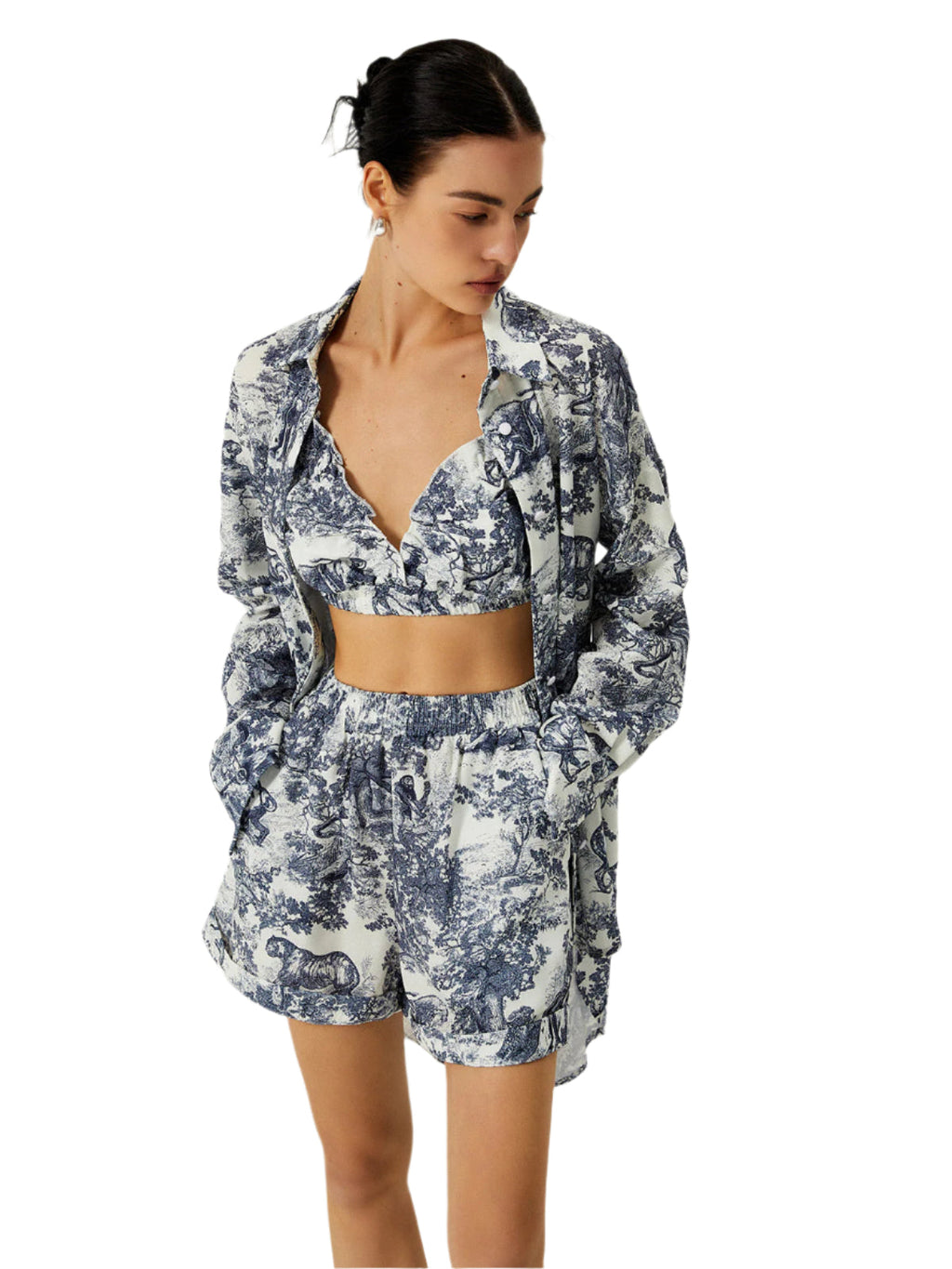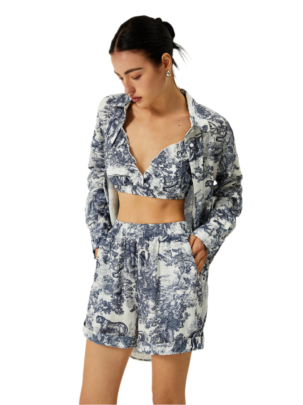 Træd ud i solskinnet med Karen blomsterprintet sommersæt i 3 dele – dit go-to outfit til varme sommerdage. Sættet indeholder en cropped top, lette shorts og en luftig overskjorte – alle med et smukt blomsterprint, der fremhæver din naturlige udstråling. Uanset om du slapper af derhjemme eller slentrer langs stranden, udstråler dette sæt ubesværet sommerlig elegance.