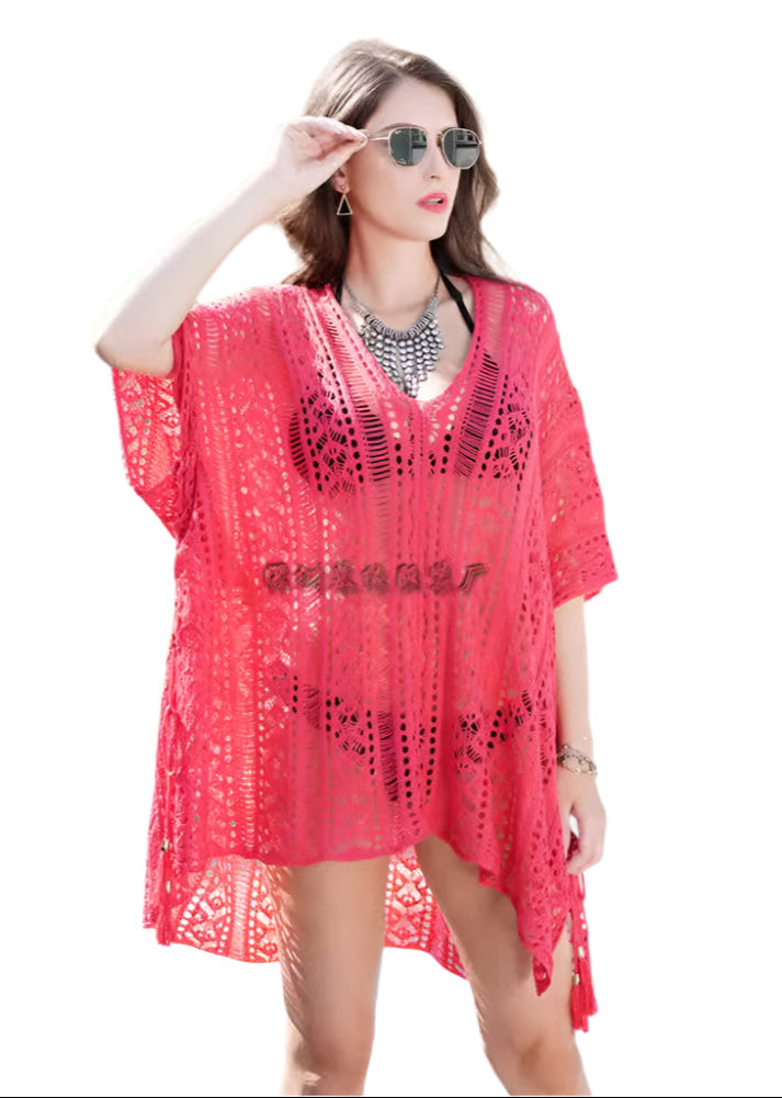 Diese Bikinibedeckung ist Ihr perfekter Begleiter für den Urlaub, Strandausflüge oder Resort-Aufenthalte. Die elegante Drapierung, der tiefe Ausschnitt und die lockere Passform betonen jede Körperform, während die kurzen Ärmel und das atmungsaktive Material Ihnen helfen, selbst in der Sonne kühl zu bleiben. Kombinieren Sie es mit Ihrem Lieblingsbikini oder einem Einteiler, um Ihr Strandoutfit sofort aufzupeppen.