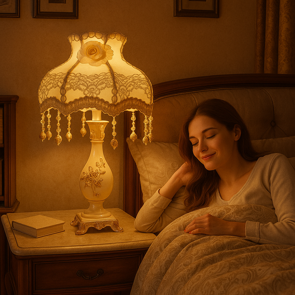 Die LaceDream - Pastoral Dome Nachttischlampe bringt einen Hauch von zarter Eleganz in Ihr Schlafzimmer. Mit einem weichen Stoffschirm und kunstvollen Spitzenverzierungen schafft diese Lampe eine warme, einladende Atmosphäre, die perfekt für Ihren Nachttisch ist. Ihr zeitloses Design ergänzt mühelos jede Einrichtung und verleiht Ihrem Raum einen Hauch von Charme.