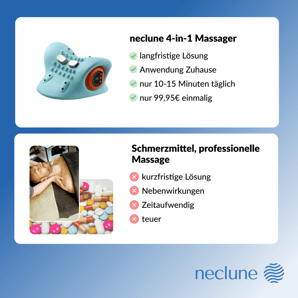 Leidest du unter Nacken- oder Schulterschmerzen oder Bandscheibenbeschwerden? Das Neclune® Massagegerät vereint Dehnung, Massage, EMS & Wärmefunktion, um Verspannungen zu lösen und die Durchblutung zu fördern.